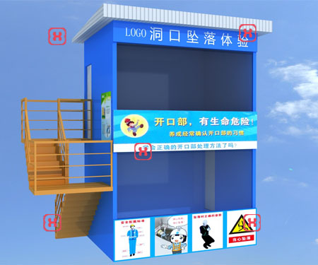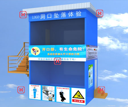 2、體驗(yàn)時(shí)體驗(yàn)人員雙手抱胸、雙腿曲膝站立在墜落門指定位置上,按動(dòng)遙控按鈕通過伸縮突然開啟活動(dòng)門從洞口墜落,使體驗(yàn)人員感受洞口安全管理不足的危害。